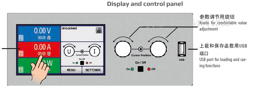 設定與實際輸出電壓、電流與功率都清晰顯示于圖形顯示器上。彩色的TFT屏幕為點觸式,用一個手指就能控制所有功能。通過旋鈕或者數字鍵盤直接輸入參數,也可調節設定電壓、電流、功率或阻值(內阻模擬)。若想防止意外操作,可鎖定所有操作鍵。